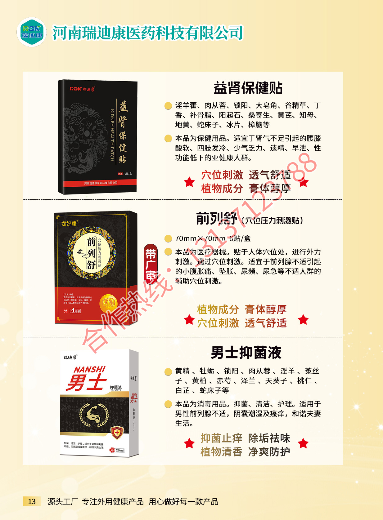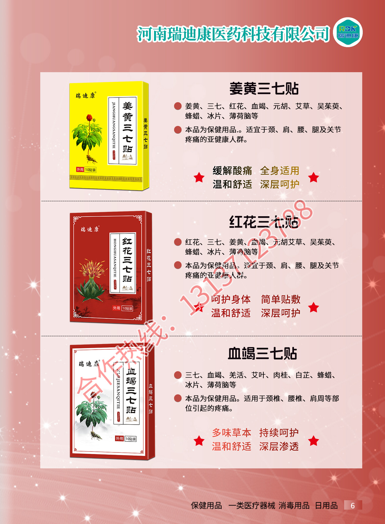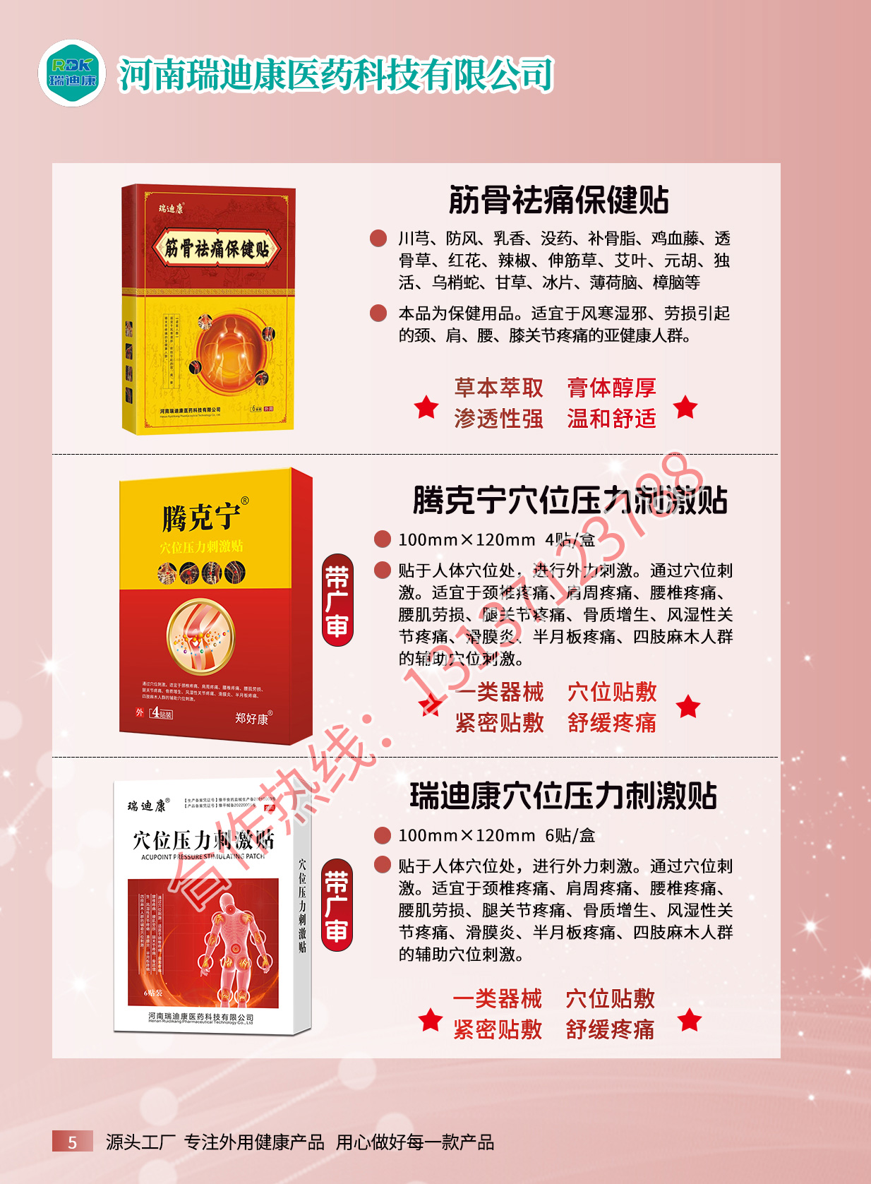 瑞迪康外用疼痛產(chǎn)品有腰椎疼痛保健貼、筋骨祛痛保健貼、滑膜保健貼、騰克寧筋骨疼痛保健液、艾灸保健液、騰克寧穴位壓力刺激貼、瑞迪康穴位壓力刺激貼、姜黃三七貼、紅花三七貼、血竭三七貼等產(chǎn)品。源頭廠家,資質(zhì)齊全,支持一件代發(fā),貼牌定制,來樣加工。適用多種渠道:實(shí)體店、線上線下、電商直播、社群。合作熱線:13137123788...