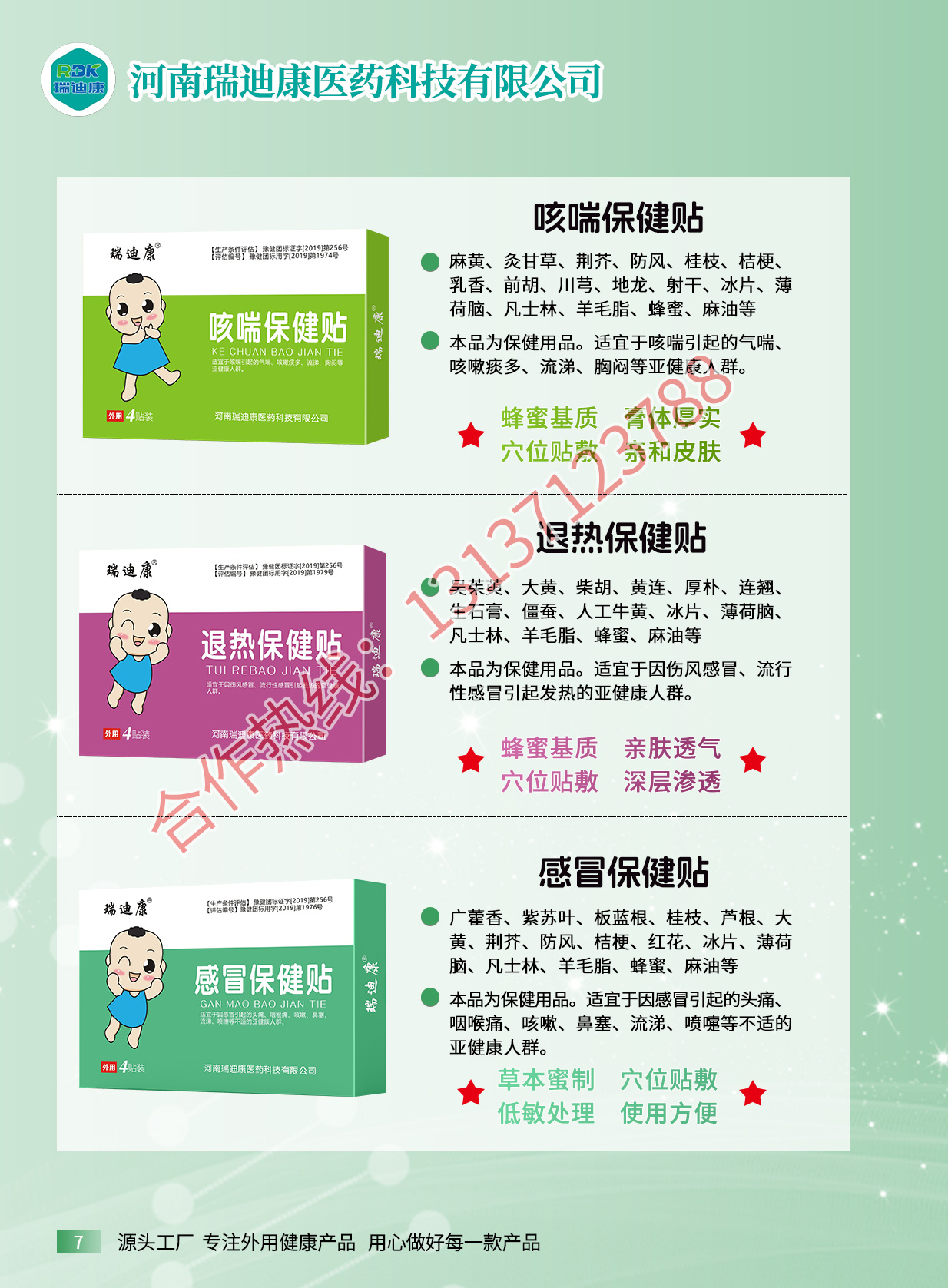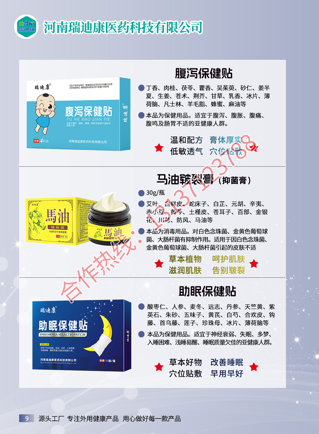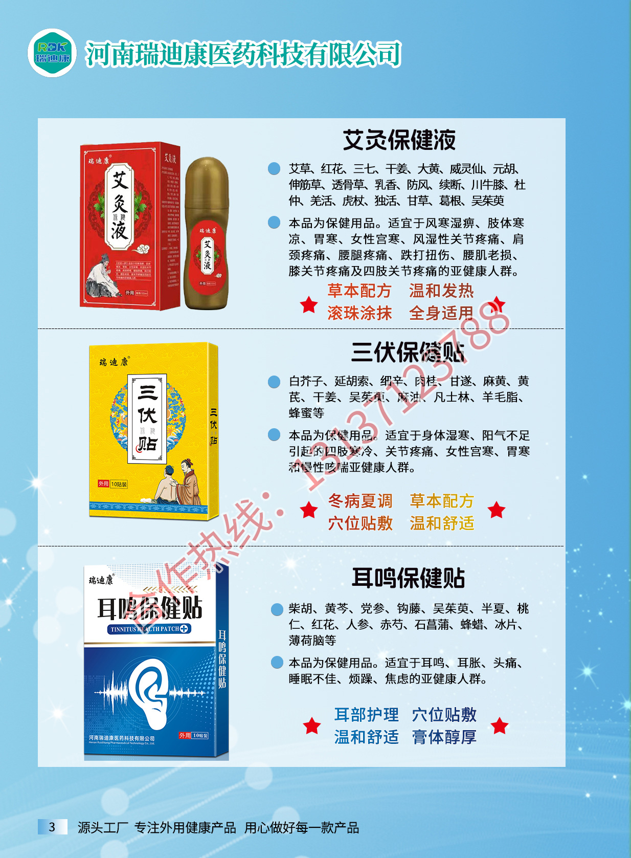 瑞迪康外用疼痛產(chǎn)品有腰椎疼痛保健貼、筋骨祛痛保健貼、滑膜保健貼、騰克寧筋骨疼痛保健液、艾灸保健液、騰克寧穴位壓力刺激貼、瑞迪康穴位壓力刺激貼、姜黃三七貼、紅花三七貼、血竭三七貼等產(chǎn)品。源頭廠家,資質(zhì)齊全,支持一件代發(fā),貼牌定制,來樣加工。適用多種渠道:實(shí)體店、線上線下、電商直播、社群。合作熱線:13137123788...