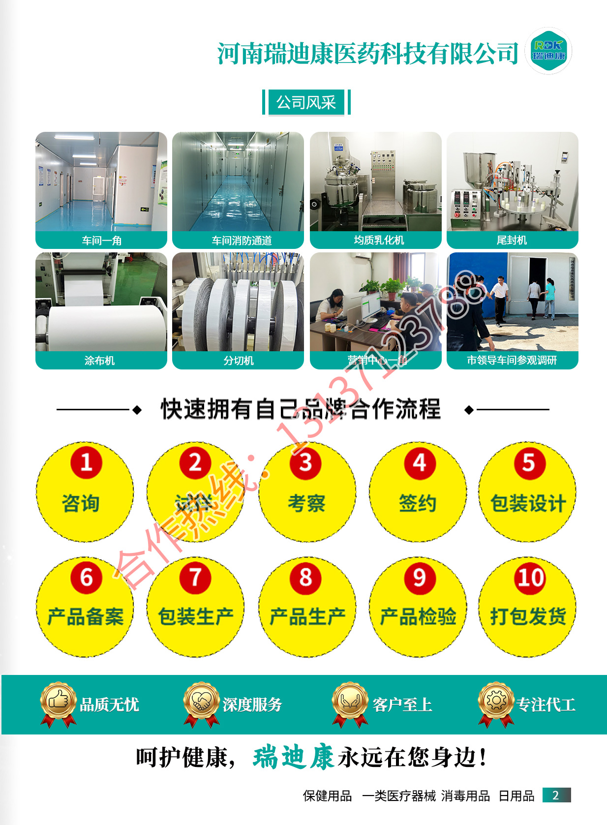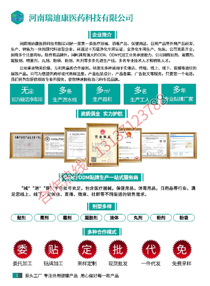 河南瑞迪康醫(yī)藥科技有限公司主要經(jīng)營一類器械、衛(wèi)消證字號(hào)產(chǎn)品OEM、抑菌制劑OEM(液體、膏體、黑膏貼劑、凝膠)、健證字號(hào)產(chǎn)品OEM、保健用品OEM(粉劑、黑膏貼劑、膏劑、片劑、凝膠)。主要加工模式:OEM貼牌加工、ODM加工、委托加工、貼牌加工。咨詢電話:13137123788